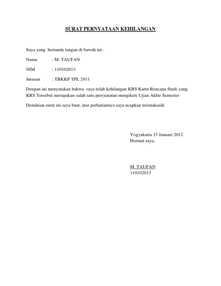 Surat Pernyataan Kehilangan / Contoh Surat Pengantar Permohonan Surat Kehilangan Buku ... : Tentunya masih banyak model yang lain, namun pada intinya hampir sama.